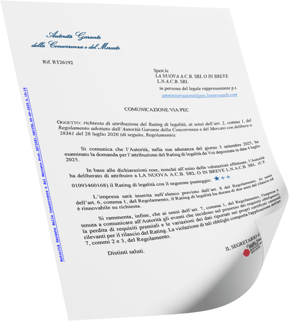 Siamo lieti di comunicare che La Nuova ACB S.r.l., leader nel settore degli animali da reddito, ha ottenuto l’attribuzione del Rating di Legalità da parte dell’Autorità Garante della Concorrenza e del Mercato (AGCM).